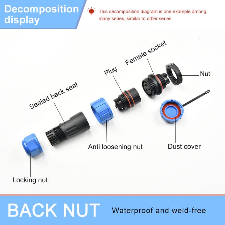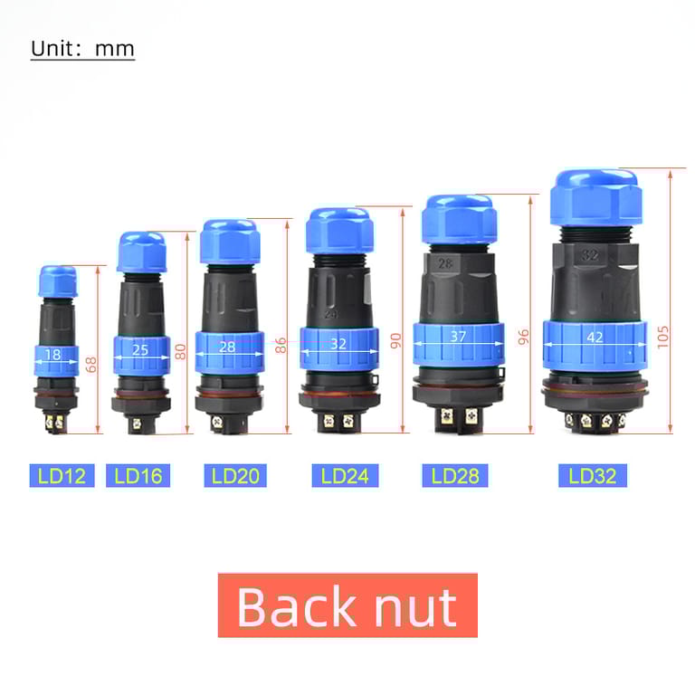 The LD Series Waterproof Aviation Plug and Socket Rear Nut Panel Mount Series is designed for high-reliability industrial equipment, covering seven models: LD12/16/20/24/28/32. The product adopts a rear nut panel mounting method, achieving secure installation through a threaded locking structure. It features an IP68 protection rating and an operating temperature range of -25℃ to 85℃. The full series uses nylon PA housing and high-temperature resistant insulating materials, with contacts plated with gold-imitation finish. It supports screw crimping termination and is suitable for scenarios requiring long-term fixed connections, such as new energy distribution cabinets, industrial control boxes, and power equipment.